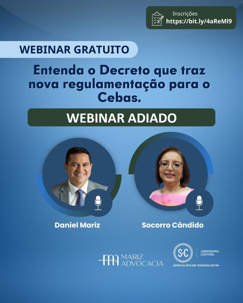 O evento que estava marcado para o dia 17 de janeiro de 2024 (quarta-feira), às 16h agora acontecerá dia 05 de fevereiro de 2024 às 16h, com transmissão pelo canal do YouTube da @seccontabil, em virtude de ajustes necessários para garantir uma apresentação completa e esclarecedora, decidimos adiar o webinar que abordaria as recentes regulamentações do Decreto para o Cebas. Pedimos desculpas por qualquer inconveniente causado e agradecemos imensamente pela compreensão. Estamos comprometidos em oferecer um evento de alta qualidade e informaremos a nova data assim que estiver confirmada. Continuem atentos às nossas redes sociais para as atualizações. Agradecemos por fazerem parte desta jornada conosco!