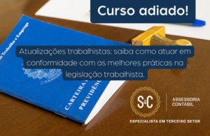 O curso “Atualizações trabalhistas: saiba como atuar em conformidade com as melhores práticas na legislação trabalhista” a ser realizado no dia 02 de setembro de 2023, foi adiado para o dia 07 de outubro de 2023 em virtude da não formação mínima de inscritos para sua realização. Entendemos que isso pode causar algum inconveniente, e pedimos desculpas por qualquer transtorno que essa alteração possa causar em suas agendas. Caso a nova data não seja conveniente para algum dos inscritos, pedimos que entrem em contato conosco o mais rápido possível para discutirmos possíveis soluções.