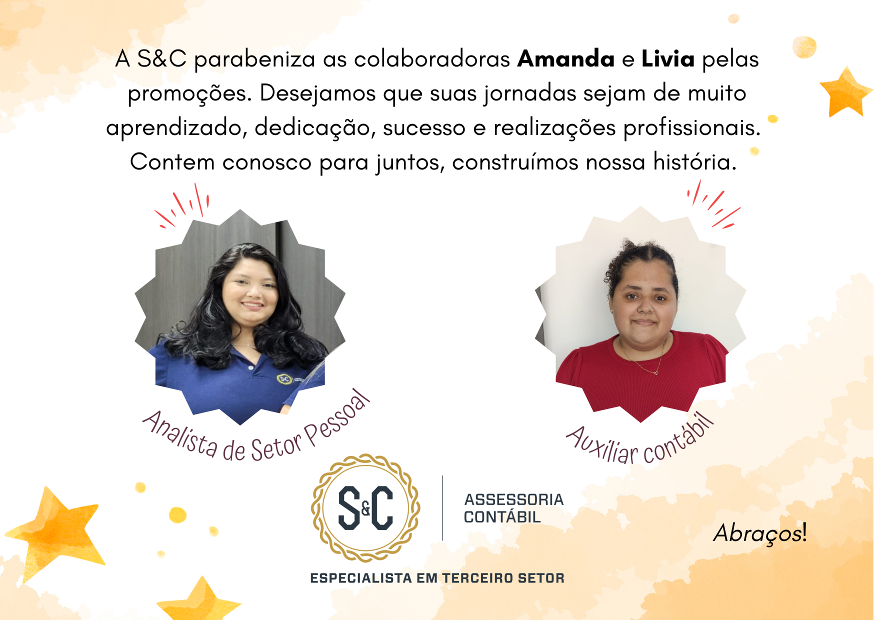 A S&C parabeniza as colaboradoras Amanda e Livia pelas promoções. Desejamos que suas jornadas sejam de muito aprendizado, dedicação, sucesso e realizações profissionais, Contem conosco para juntos, construímos nossa historia.