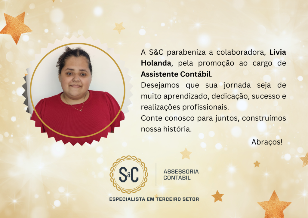 A S&C parabeniza a colaboradora, Livia Holanda, pela promoção ao cargo de  Assistente Contábil. Desejamos que sua jornada seja de muito aprendizado, dedicação, sucesso e realizações profissionais.